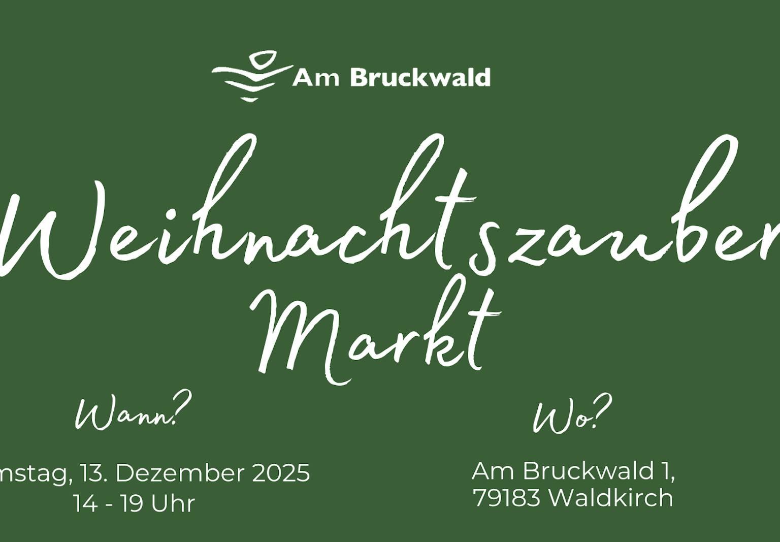 Am Samstag, den 13. Dezember 2025 findet von 14-19 Uhr der Weihnachtszauber-Markt am Bruckwald in Waldkirch statt.