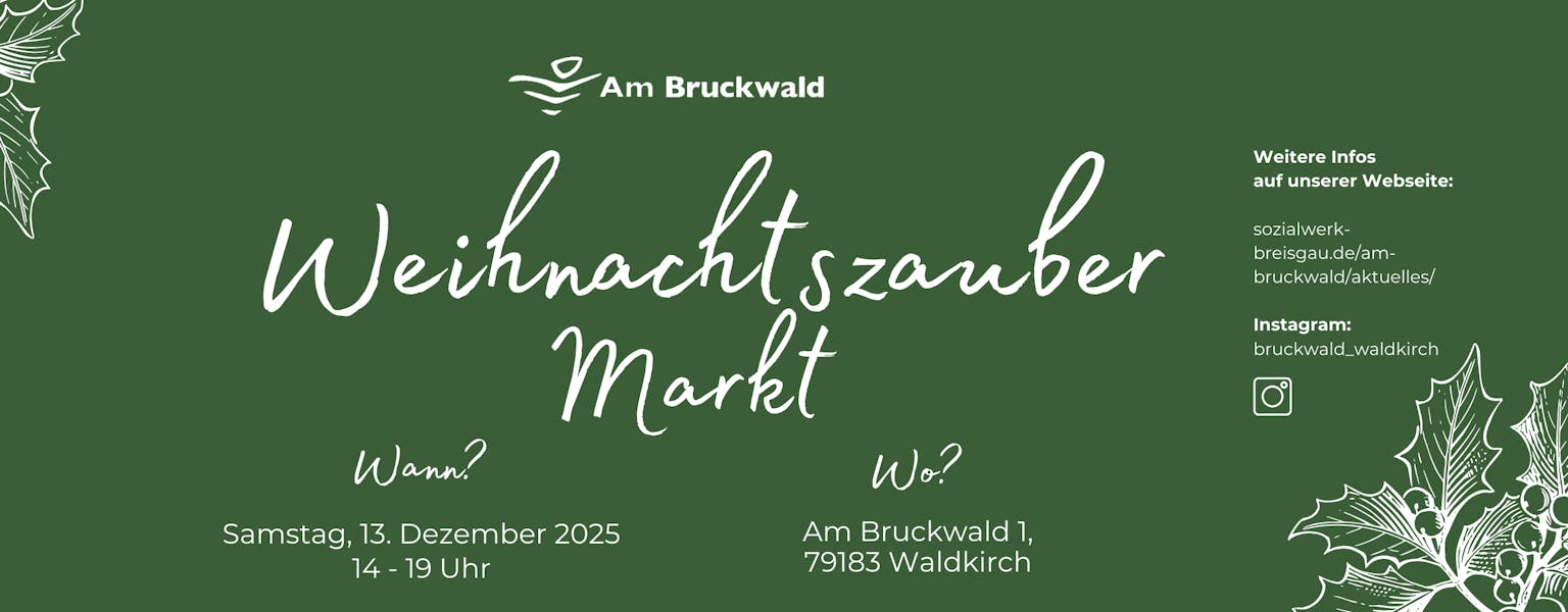 Am Samstag, den 13. Dezember 2025 findet von 14-19 Uhr der Weihnachtszauber-Markt am Bruckwald in Waldkirch statt.